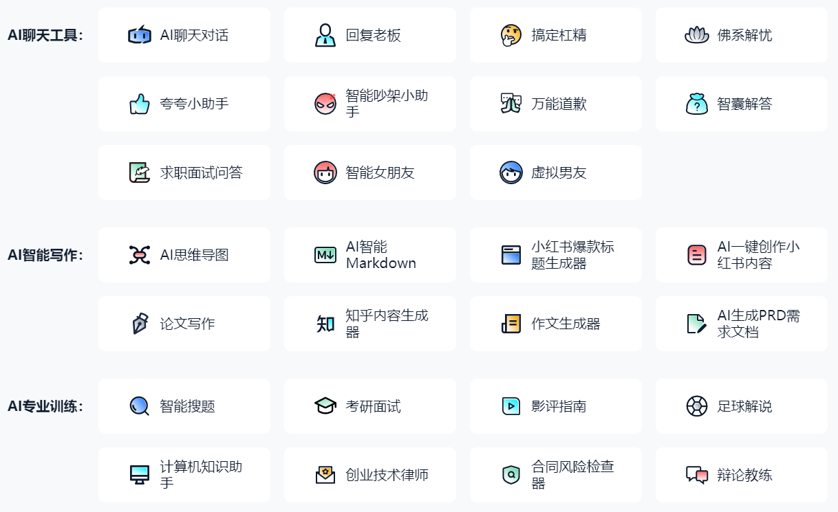 AI文娱:emoji脸色从动生成、小红书添加脸色、取名神器、脱口秀梨园子弟、占星师、私家厨师、好评神器、诙谐答复。智能写做:AI思维导图、AI智能Markdown、小红书爆款题目生成器、AI一键创做小红书内容、论文写做、知乎内容生成器、做文生成器、AI生成PRD需求文档。AI代码帮手:代码生成器、R编程注释器、机械进修工程师、全栈软件开辟、VBA代码帮手、Python代码生成、代码纠错、Swift代码生成。